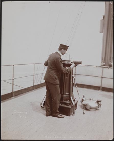 A uniformed seaman atop the bridge of the S.S. "Deutschland".