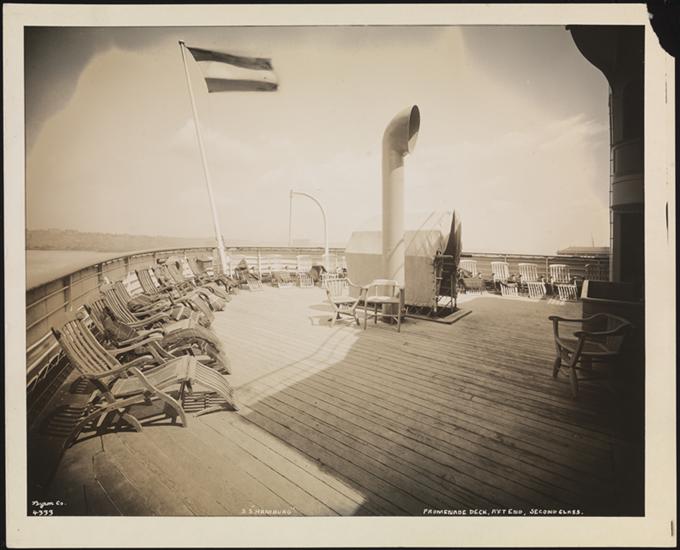 United American Lines, S.S. "Hamburg", Pier 86 North River, First Class Promenade Deck Looking Forward.