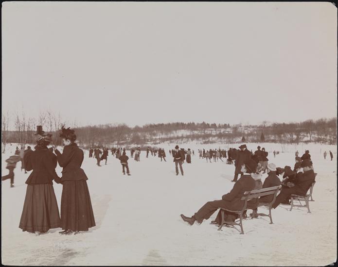 People skating and seated on benches on a frozen lake at Van Cortlandt Park.