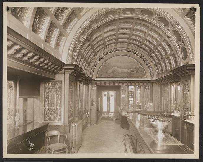 Description Billie Considine's cafe/bar, at the Hotel Metropole at Broaday & 42nd Street, with bar, mural and vaulted coffered ceiling.