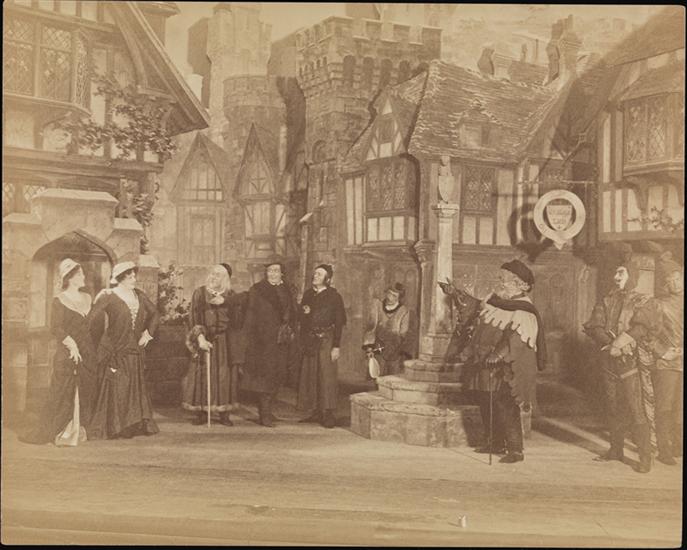 Edith Wynne Matthison as Mistress Ford, Rose Coghlan as Mistress Page, Theodore Roberts as Falstaff and the cast of the New Theatre production of William Shakespeare's "The Merry Wives of Windsor," presented in 1910.