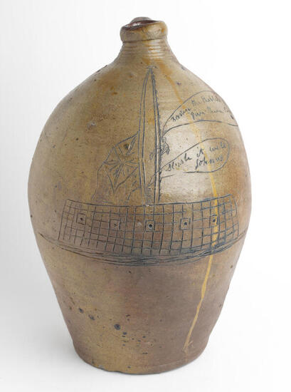 Salt-glazed stoneware "Evacuation Day Jug" with gray body, interior ochre slip, ovoid body with short neck, and thick irregular molded lip and incised rings below. Scroll handle with over fired cobalt oxide at either end. Front of jug decorated with an incised sketch in cobalt oxide depicting a portion of a fort, a flagpole with a partially raised British Flag, and a man on the pole with a bucket.