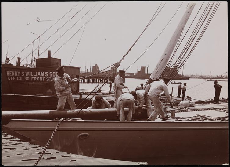 The crew of the "Valkyrie" working on the boom while the ship is docked at a pier. The sign "Henry S. William's Son/Office 30 Front St." is visible.
