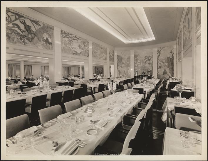 S.S. "America" at Newport News Shipyard, VA, Tourist Class, Interior, Dining Room.