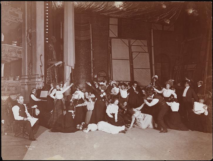 "Grouping a mob in 'The Children of the/Ghetto,' showing how the stage director/has to plan each individual actor" in pencil on verso. | Photographer's stamp on verso, including credit line and permis