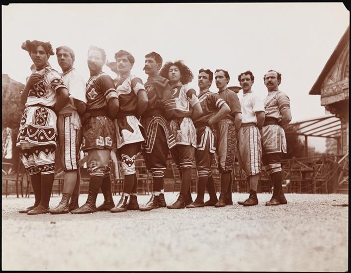 Description Arabian Acrobats posing as a group on the roof of Hammerstein's Victoria Theatre, located at 42nd Street and Seveth Avenue, New York City.