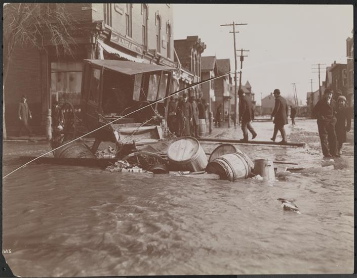 People in flooded street and on sidewalk with carriage with contents dumped onto flooded street visible.