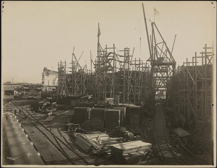 Railroad tracks and shipbuilding scaffolding at the Newburgh Shipyards, Newburgh, N.Y.