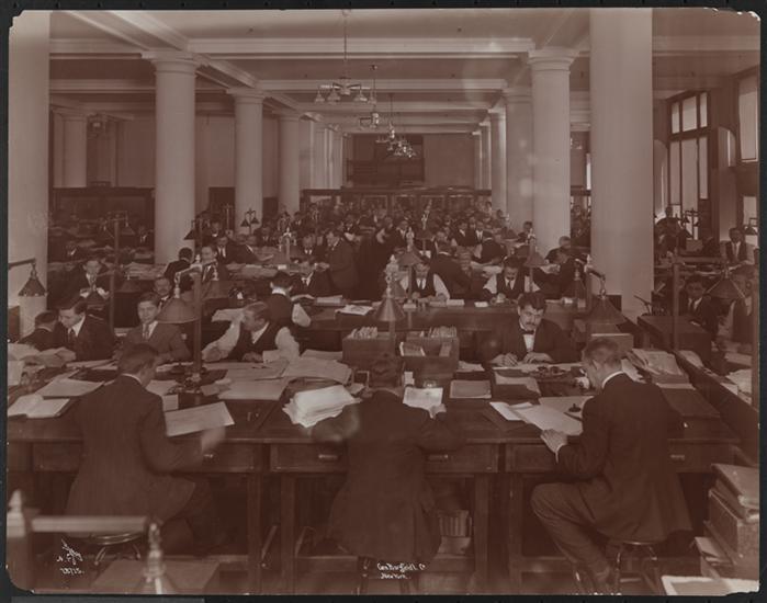 Interior of George Borgfeldt & Co. office pool; male office workers busy doing paper work at desks.