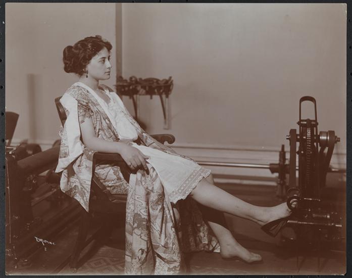 Description Woman seated with one foot in a metal contraption at the Zander Institute, where therapeutical excercise was carried out by means of special apparatus.