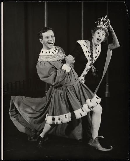 [Jack Gilford as The King Sextimus and Jane White as The Queen Aggravain in "Once Upon a Mattress".]