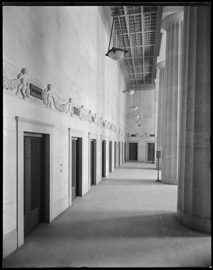 Broadway and Dey Street. New York Telephone and Telegraph Building. Interior, elevator corridor