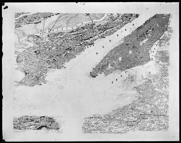 Hudson River Bridge. Bird's-eye view of N.Y. approach by John T. Cronin, rendering 1928.