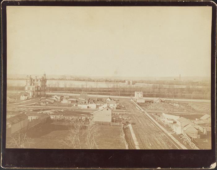 [View from the roof of George Ehret's home at Park Avenue and 94th Street.] Looking southeast, showing 93rd Street and Lexington Avenue. The litte frame house on 93rd between Park and Lexington Avenue
