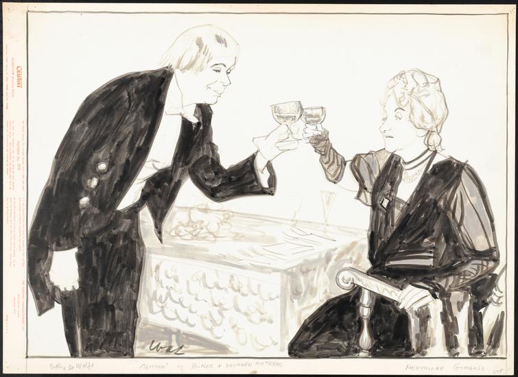 [Christopher Hewett as Collins and Hermione Gingold as Mrs. Bennett in "First Impressions".]