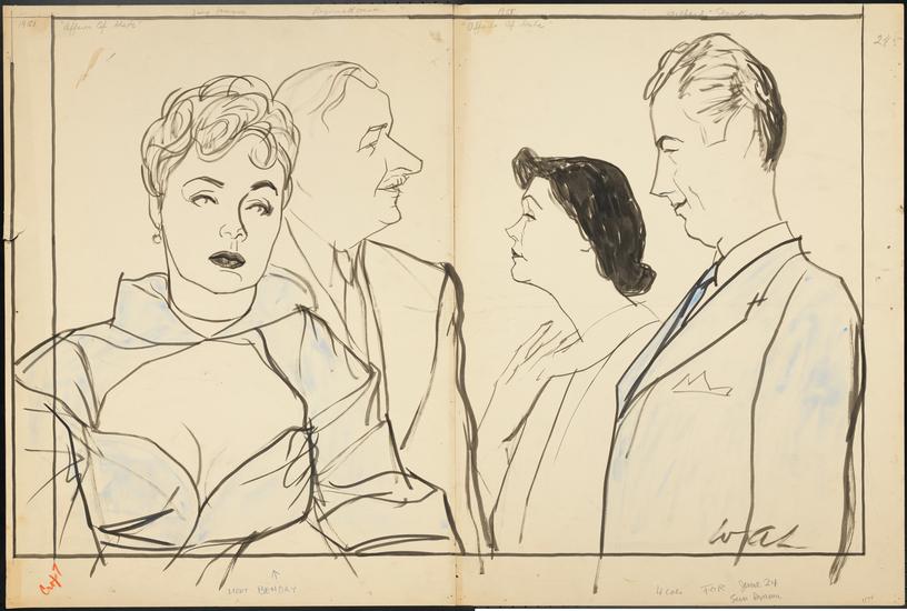 [Celeste Holm as Irene Elliott, Shepperd Strudwick as George Henderson, Barbara O'Neil as Constance Russell, and Reginald Owen as Philip Russell in "Affairs of State".]