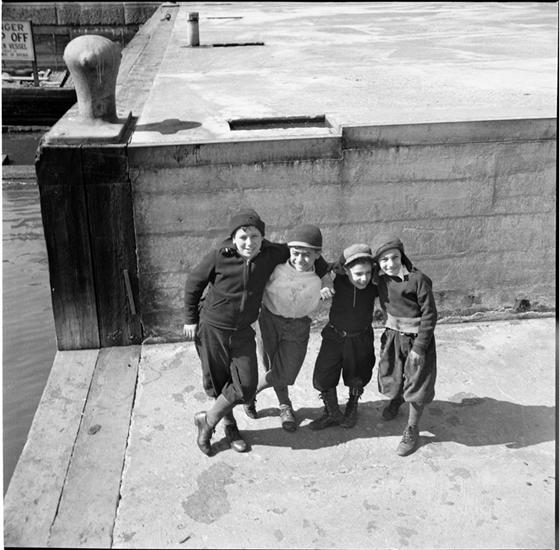Waterfront. [Boys sitting on a wharf.]
