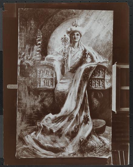 Photograph of a painting of a woman holding a septor, etc.; signed "Edmund Russell."