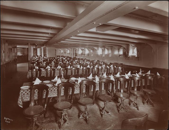 "H-A Line, S.S. President Lincoln" on neg; "3rd Class Dining Room" on neg of duplicate print.