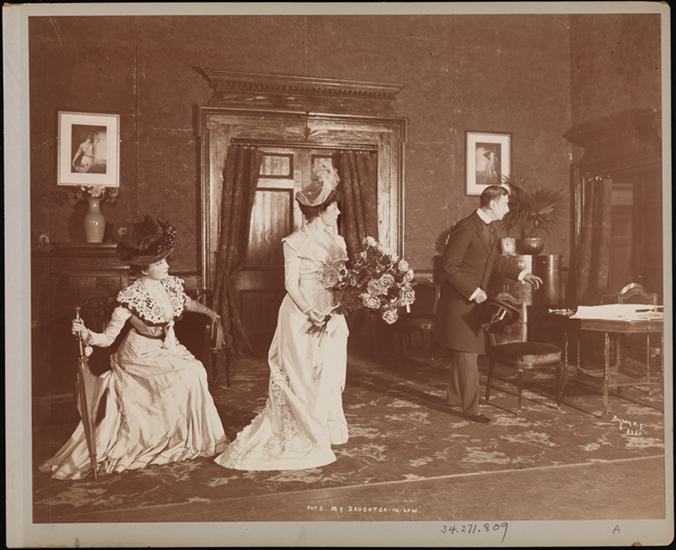 A scene from the New York production of Fabrice Carre and Paul Bilhaud's play "My Daughter-In-Law," featuring the Charles Frohman London Comedians including Herbert Standing, Seymour Hicks, Ferdinand Gottschalk, Fannie Brough, Josephine Gautier, and Ellaline Terriss.
