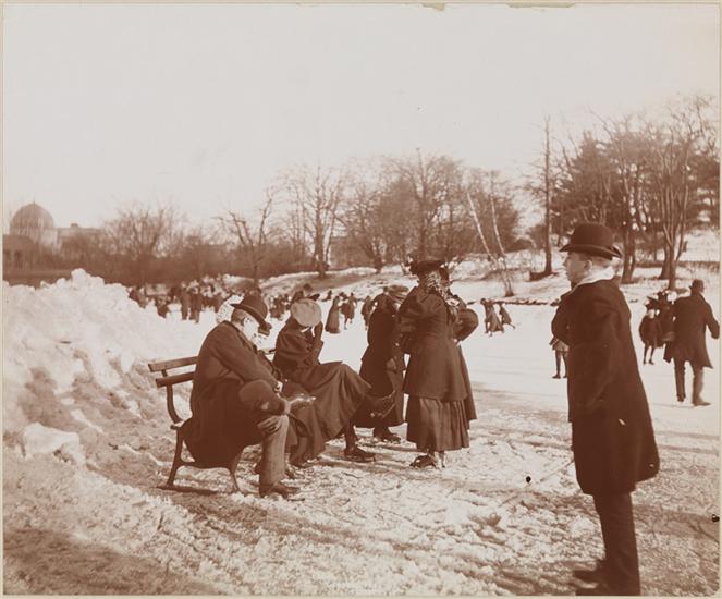 In ink on verso:"Sports, Skating-Central Park 1894/Byron No. 1598/Neg. No. 404". | Numbered on neg. | "Central Park 72nd St. Lake" on neg. | Stamp on verso:"Museum of the City of New York Byron Collec