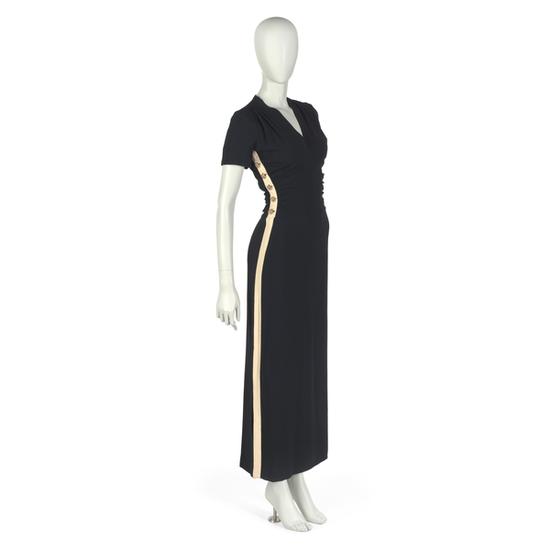 Evening ensemble comprising jacket and strapless dress in black silk rep