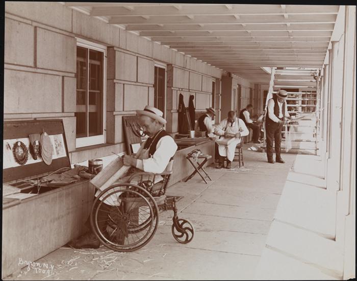 Men, one in a wheel-chair, weaving baskets at Sailor's Snug Harbor, a facility and home for retired sailors on Staten Island, New York.