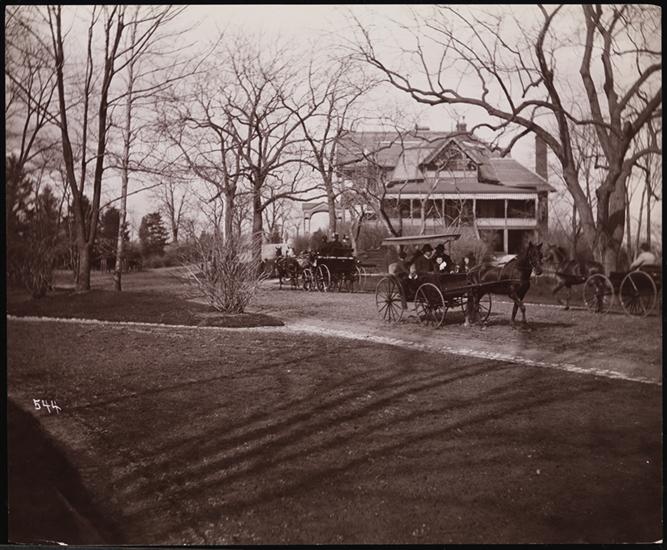 What is supposedly McGowan's Pass Tavern at Tuxedo Park, N.Y.; horse drawn carriages on road in bucolic setting.