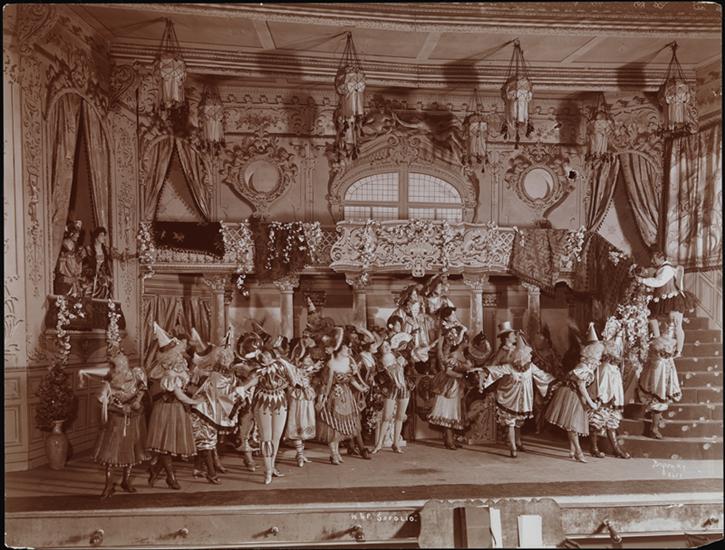 A scene from Weber and Fields' burlesque of Clyde Fitch's translation of Alphonse Daudet's "Sapho" called "Sapolio," a "Clean travesty of 'Sapho'" presented at the Weber and Fields Music Hall in 1900.