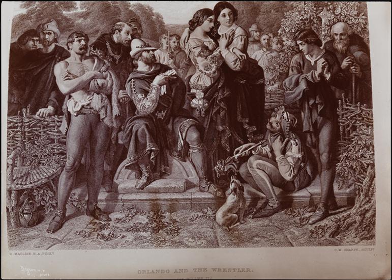 Photoreproduction of an engraved book illustration titled "Orlando and the Wrestler," a scene from William Shakepeare's "As You Like It," engraved by C.W. Sharpe after an original by D. Maclise.