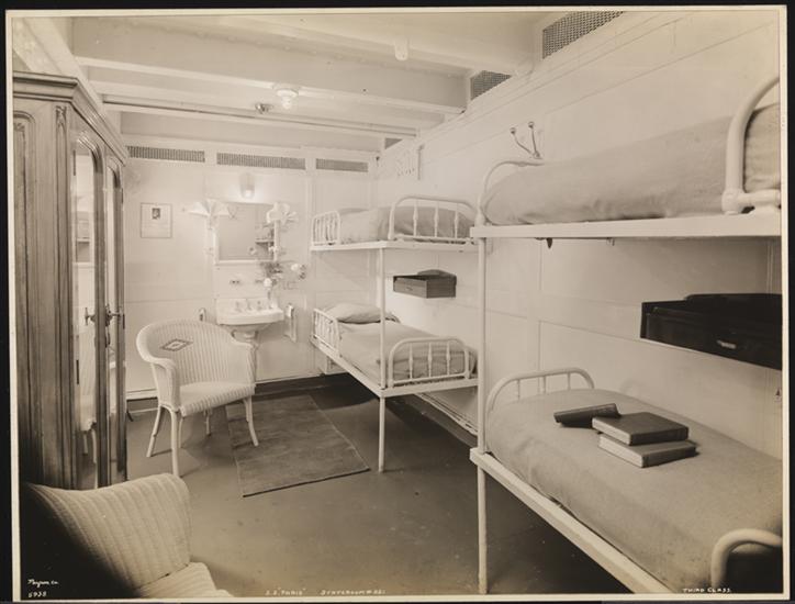 French Line, S.S. "Paris" Pier 88 N.R., Third Class, Interior, Inside 4 Berth Cabin #821.