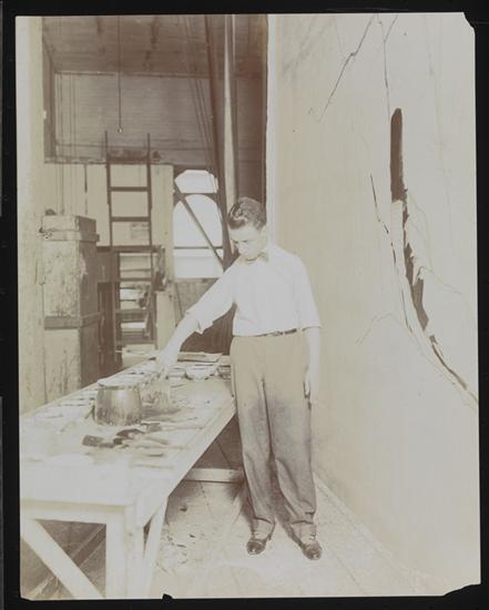Description Un identified scenic artist in the workshop of John Young and Brothers mixes paint media, developing the color for a backdrop in the process of being painted.