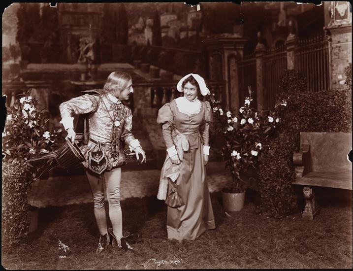 "'Twelfth Night'" on neg. | "Twelfth Night/New Theatre/1909-'10" in pencil on verso. | Typed on label glued to verso:"'Twelfth Night'/Olivia's Garden/Ferdinand Gottschalk as Sir Andrew Aguecheek/Jessi