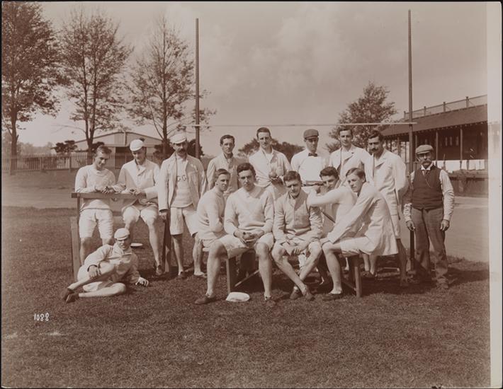 Portrait of a track and field team at the Oxford and Cambridge training session at the Berkeley Oval, New York.
