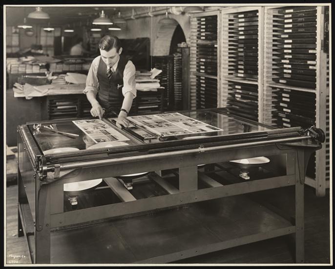 Unz & Co., Printers and Stationers, Second Floor, Man Working on Overlay at Press.