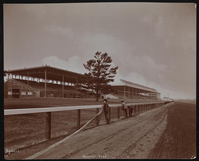 Men working on a fence, grand-stands beyond, at Belmont Park Race Track, Elmont N.Y.