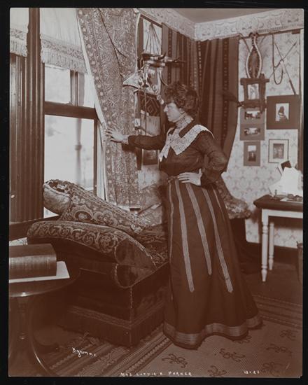 Mrs. Lottie B. Parker (author of "Way Down East") standing looking out window.