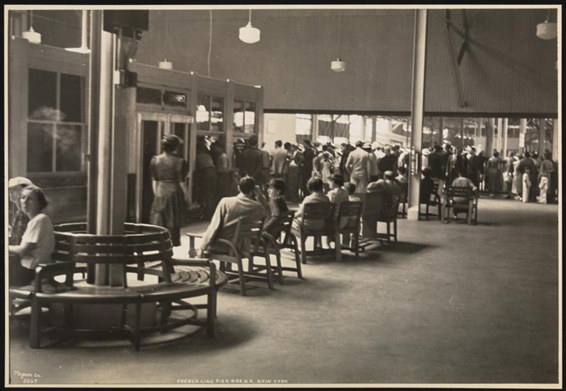 French Line, 610 Fifth Ave., "Normandie" Leaving Pier #88 N.R., Pier Scenes, Passengers Entering Elevators on Upper Level.