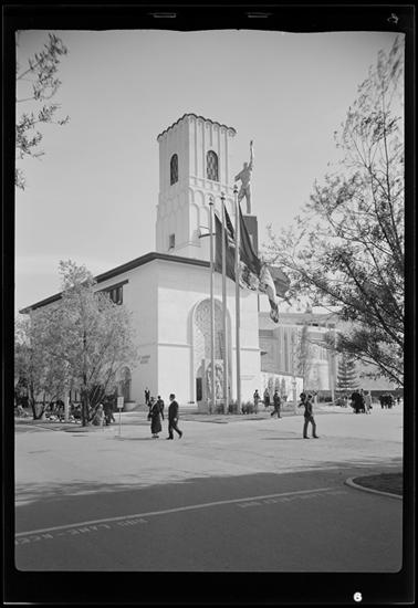 New York Worlds Fair, Glass Building, exterior, courtyard exhibit.