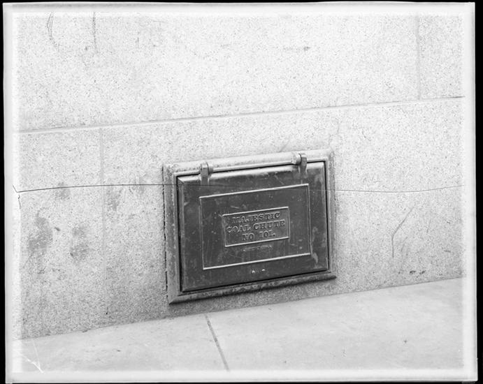 87th Street and Amsterdam Avenue, S.E. corner. Apartment house, view of exterior and Majestic Coal chute.