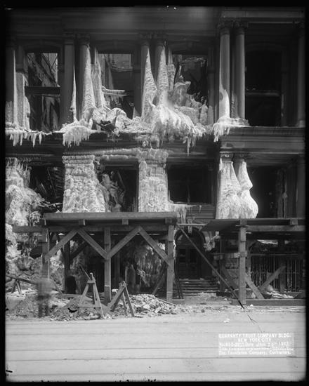 Cedar Street and Broadway. Fire at old Equitable Building Guaranty Trust Company Building, melting ice with steam.