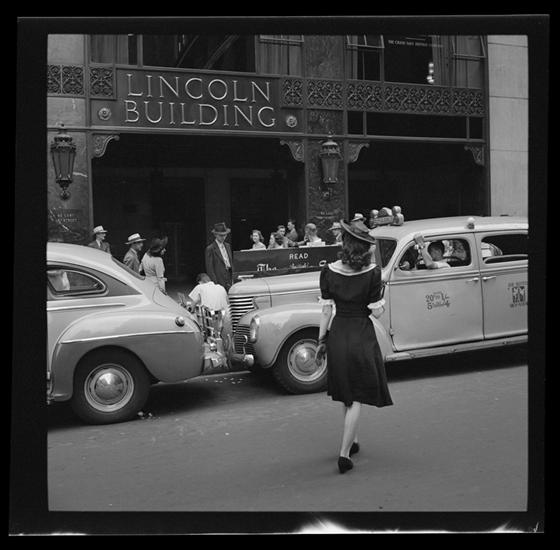 60 East 42nd Street. Lincoln Building, looking south at newsstand in front of entrance, 1:05 p.m.