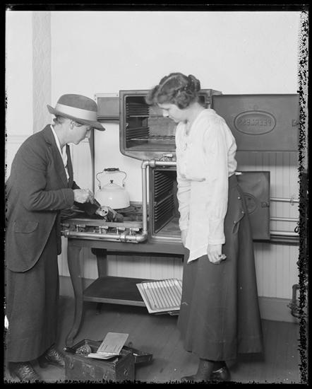 155th Street and Amsterdam Avenue. IV. Woman showing housewife how to replace gas mantles on C.E.Z. light, taken at Branch V, to illustrate women in gas business.