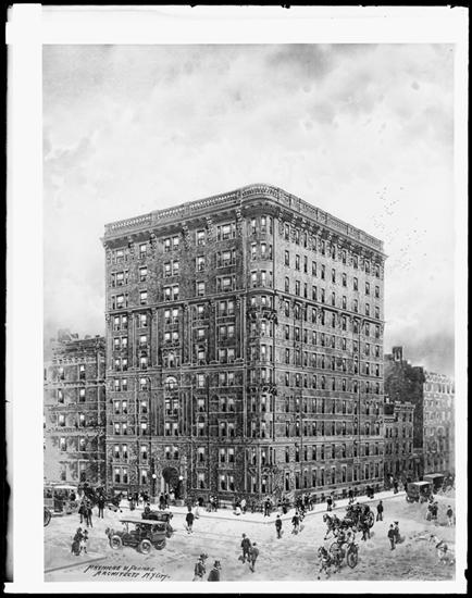 West 70th Street at the corner of Central Park West. The Lorington Apartments, watercolor rendering by Hughson Hawley, 1903.