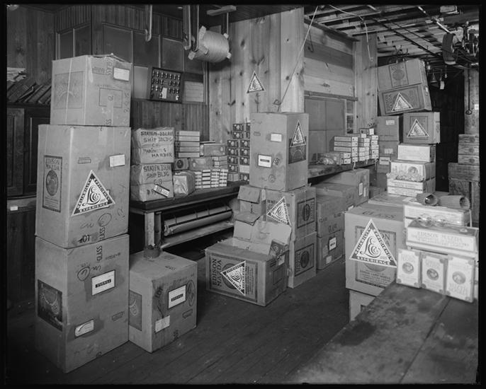 [Store room at Lord Electric Company, 333 West 49th Street.]