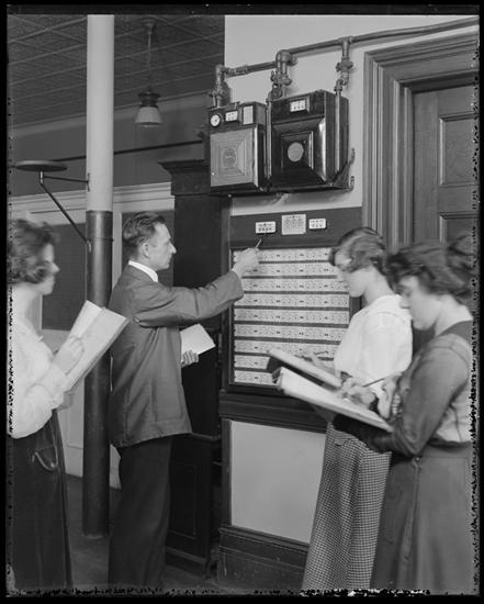 155th Street and Amsterdam Avenue. VI. Woman indexer reading meters, taken at Branch V, to illustrate women in gas business.