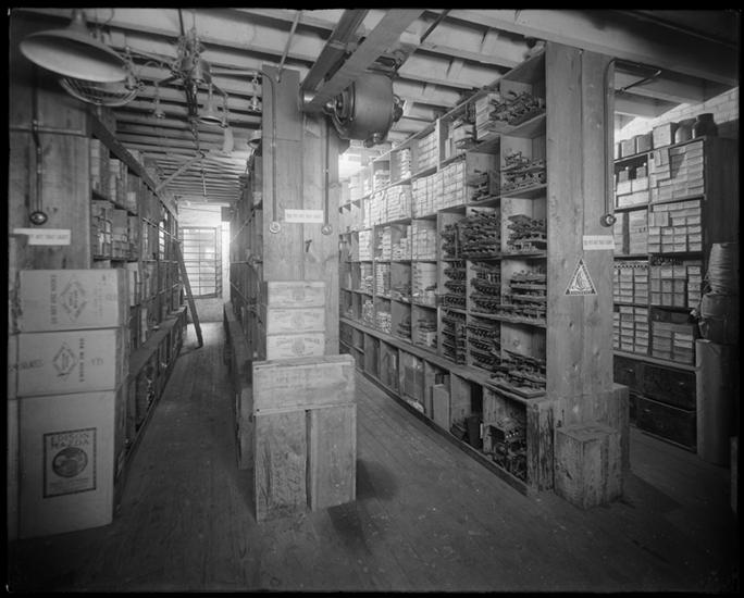 [Store room at Lord Electric Company, 333 West 49th Street.]