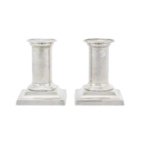 One of a pair of candlesticks with plain columnar shaft in square base and removable circular bobeche with molded rim. Inscription: Engraved on base: Margaret P. Meyer / from / Theodore Roosevelt / Sept. 2nd, 1890. Mark: Marked on reverse: [five pseudohallmarks in reserves.]