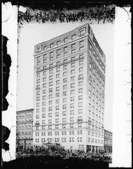 West 58th Street at the corner of Seventh Avenue. Apartment house, watercolor rendering.