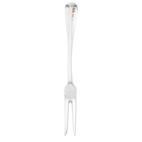 Sucket fork with rounded upturned handle, long front midrib terminating in two tines, and engraved with block cap initials. Inscription: Engraved on handle reverse in block caps: R / P H / C*R Mark: Struck on handle reverse in oval: AB